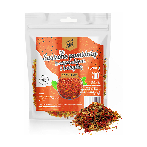Real Foods - Suszone pomidory z czosnkiem i bazylią 200g