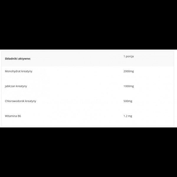 monohydrat kreatyny; maltodekstryna; jabłczan kreatyny; chlorowodorek kreatyny; witamina B6 (chlorowodorek pirydoksyny); skrobia ryżowa; aromaty; substancje słodzące: sukraloza, acesulfam K; substancje przeciwzbrylające: dwutlenek krzemu, stearynian magnezu; wyciąg z czerwonego buraka dla smaków ponczu owocowego oraz rabarbaru jabłkowego, ekstrakt z czarnej marchwii dla smaku czarnej porzeczki z cytryną, barwniki: czerwień koszenilowa A dla smaków wiśni, grejpfruta, arbuza z truskawką, maliny z truskawką, lemoniady malinowej, lemoniady wiśniowej, ponczu owocowego; tartrazyna, błękit brylantowy FCF dla smaków kiwi kaktus, pomarańcz kaktus; indygotyna dla smaków cukierków lodowych, owoców leśnych; żółcień chinolinowa dla smaków cytryny, mango marakuji, ananasa, mango z ananasem; żółcień pomarańczowa FCF dla smaków pomarańczy, pomarańczy z cytryną; kompleksy miedziowe chlorofili i chlorofilin dla smaku mięty cytrynowej; karmel dla smaków koli, koli cytrynowej. Żółcień chinolinowa, czerwień koszenilowa A, żółcień pomarańczowa FCF, tartrazyna - może mieć szkodliwy wpływ na aktywność i skupienie uwagi u dzieci.