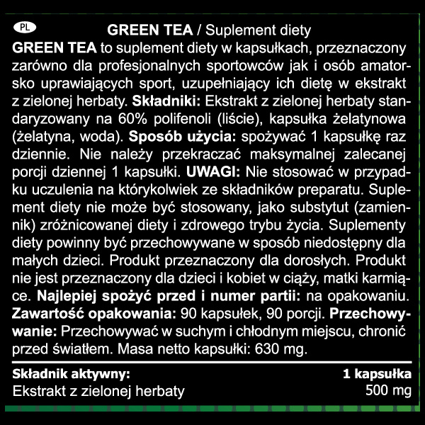 GREEN TEA to suplement diety w kapsułkach, przeznaczony zarówno dla profesjonalnych sportowców jak i osób amatorsko uprawiających sport, uzupełniający ich dietę w ekstrakt z zielonej herbaty.