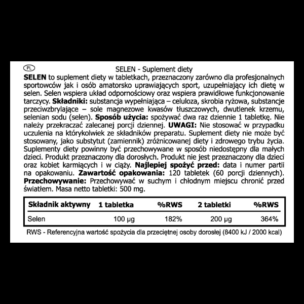 SELEN to suplement diety w tabletkach, przeznaczony zarówno dla profesjonalnych sportowców jak i osób amatorsko uprawiających sport, uzupełniający ich dietę w selen. Selen wspiera układ odpornościowy oraz wspiera prawidłowe funkcjonowanie tarczycy.