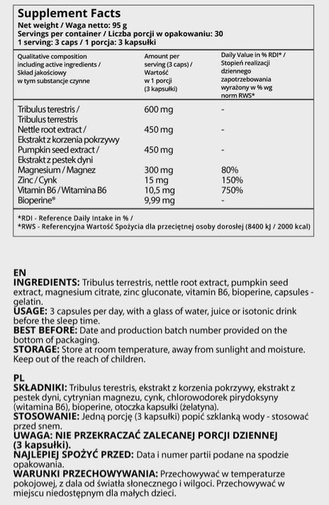 Iron Test jest kompleksowo działającym preparatem dla wszystkich mężczyzn po 35 roku życia. Tribulus Terrestris który był popularny już kilka tysięcy lat temu w medycynie dalekiego wschodu, oraz ZMA to dwa najpopularniejsze składniki używane do produkcji "boosterów testosteronu". Dodatkowo dla zmaksymalizowania efektów sięgnęliśmy po ekstrakt z korzenia pokrzywy, ekstrakt z pestek dyni, oraz bioperyne. Stosuj go przed snem i poczuj się jak Iron Horse!