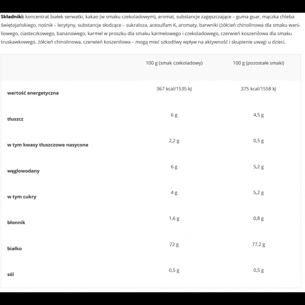 koncentrat białka serwatkowego (z mleka), kakao (w smaku czekoladowym), aromat, kwas cytrynowy (w smaku truskawkowym), substancja zagęszczająca (karboksymetyloceluloza sodowa), substancje słodzące (sukraloza, acesulfam K), ekstrakt z czarnej marchwi (dla smaku waniliowo-jagodowego), ekstrakt z buraka czerwonego (dla smaków: truskawkowy, waniliowo-jagodowy, bananowo-truskawkowy, ciasto kawowe z malinami, lody truskawkowe, biała czekolada z cytryną, jogurtowo-wiśniowy), barwniki: karoteny (dla smaków: waniliowy, waniliowo-migdałowy, bananowy, mango-banan, ciasto, biała czekolada z ananasem, cynamonowy, jabłkowo-cynamonowy, bananowo-truskawkowy, sernik waniliowy, ciasto cytrynowe z mascarpone, lody waniliowe, brzoskwiniowy); karmel amoniakalny (dla smaków: karmelowy, czekoladowy, czekoladowo-orzechowy, ciasto kawowe z malinami, cynamonowy, jabłkowo-cynamonowy, czekoladowo-śmietankowy, ciasto milionera, słony karmel, masło orzechowe, latte, mleko skondensowane).