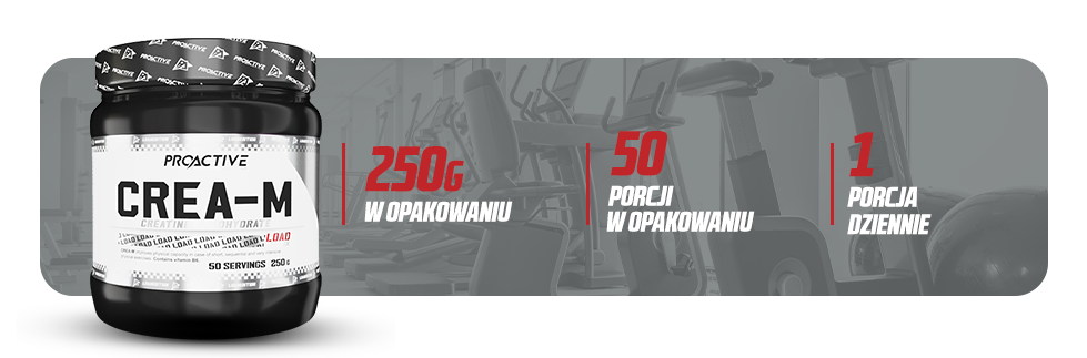 ProActive Crea M monohydrat kreatyny 250g to preparat w postaci proszku, stworzony z myślą o profesjonalnych sportowcach oraz amatorach aktywności fizycznej, którzy chcą wzbogacić swoją dietę o kreatynę pochodzącą z monohydratu kreatyny. Kreatyna wspomaga wydolność fizyczną podczas krótkich, intensywnych treningów, a jej korzystne działanie występuje przy codziennej dawce wynoszącej co najmniej 3 g.