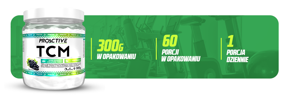 TCM to preparat w formie proszku, zawierający jabłczan kreatyny – stabilniejszą i lepiej przyswajalną formę kreatyny w porównaniu do monohydratu.