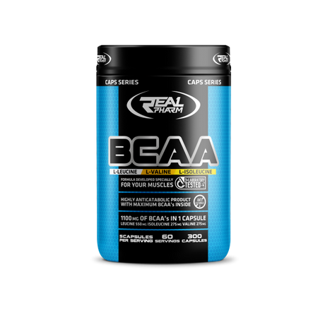 Real Pharm BCAA 1100mg 300 kapsułek to preparat zawierający aminokwasy rozgałęzione (BCAA), w tym leucynę, izoleucynę i walinę w proporcji 2:1:1. BCAA są niezbędne do regeneracji i odbudowy tkanek mięśniowych po intensywnych treningach. Produkt wspomaga syntezę białek, przyspiesza regenerację mięśniową, a także pomaga w utrzymaniu masy mięśniowej, zapobiegając jej katabolizmowi.